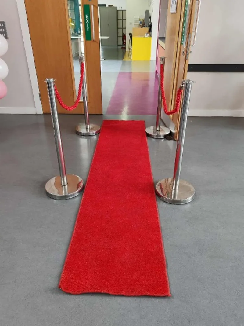 Feel like a VIP with our fabulous red glitter carpet entrance with barriers.